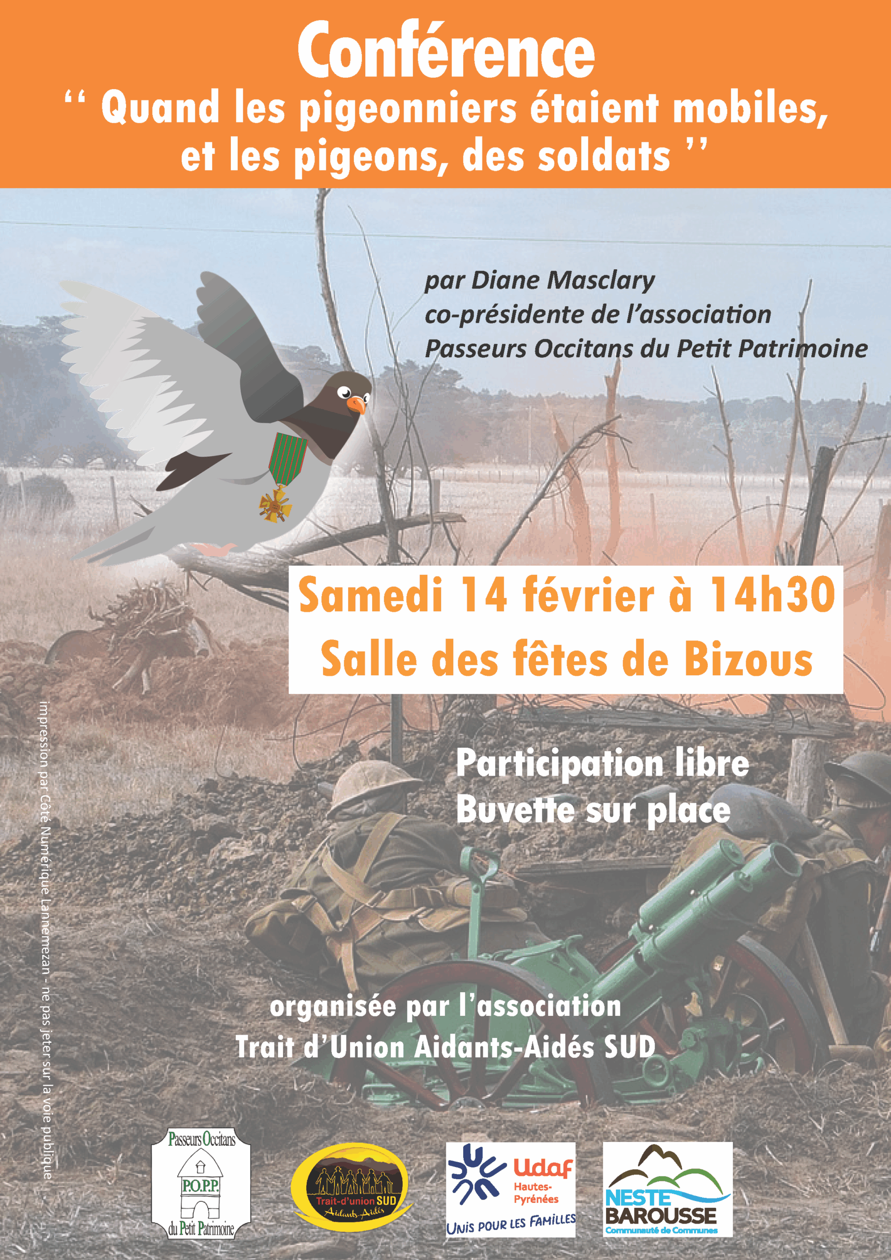 Trait d’Union recevra le samedi 14 février à 14h30 à la salle des fêtes de Bizous (65) Diane MASCLARY, co-présidente de l’association Passeurs Occitans du Petit Patrimoine (P.O.P.P.), pour une conférence « Quand les pigeonniers étaient mobiles, et les pigeons, des soldats » L’évènement est ouvert à tous. Participation libre. Buvette sur place. La dernière gazette proposait un…